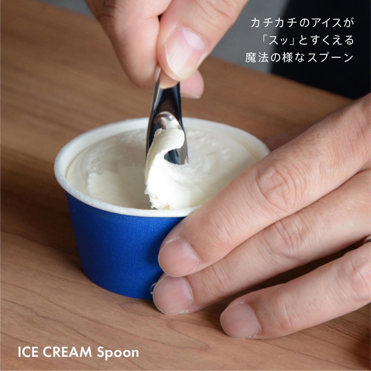 最大の特徴は、銅の優れた熱伝導性。これにより手の熱が伝わり、カチカチに凍ったアイスもスッとすくえて、溶けるのを待たずに楽しむことができます。
