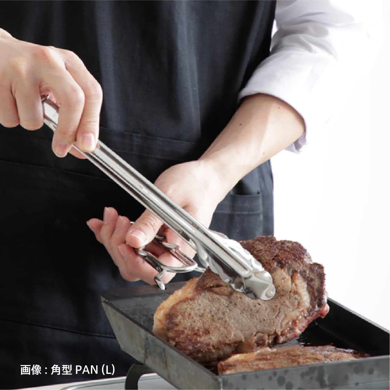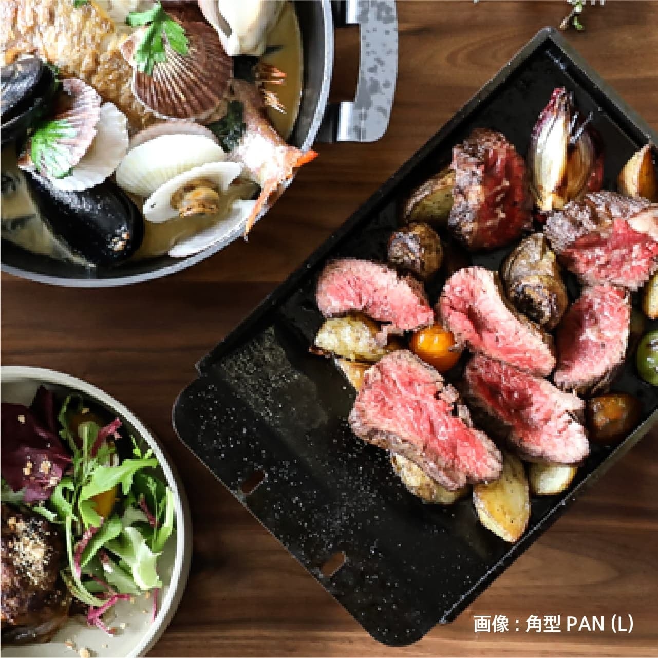 5mmの極厚鉄板が驚くほどの蓄熱力を発揮し、食材の旨みを逃さず焼き上げる「Fe5.0」角型PAN。ステーキ、ハンバーグ──どんな料理も香ばしくジューシーに仕上げます。しっかり予熱すれば温度ムラが出にくく、家庭のコンロでもプロの火入れに近い仕上がりに。