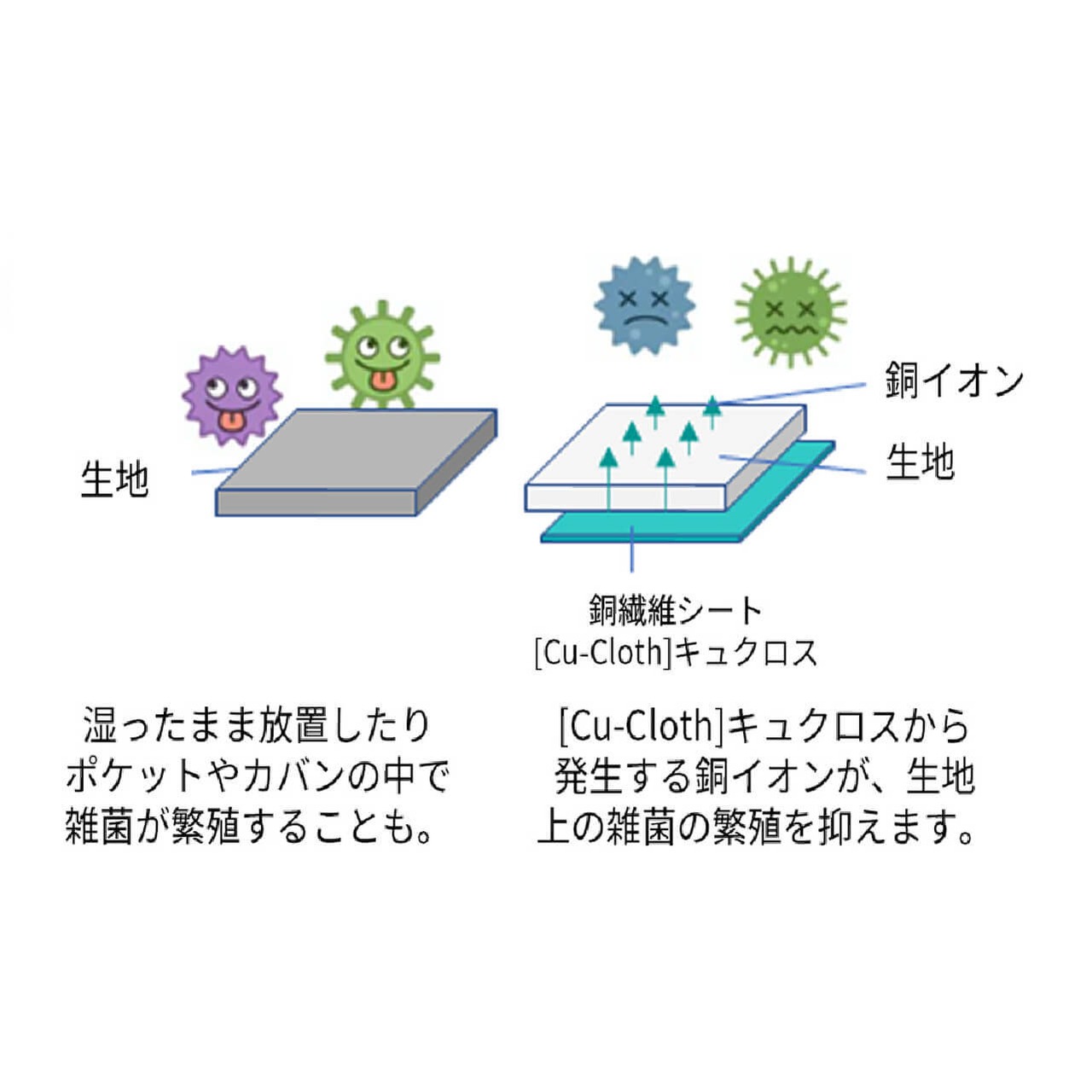 ● 濡れたまま放置しておくと銅イオンの発生で緑青が出ることがあります。定期的に洗濯し完全に乾燥させてご使用ください。